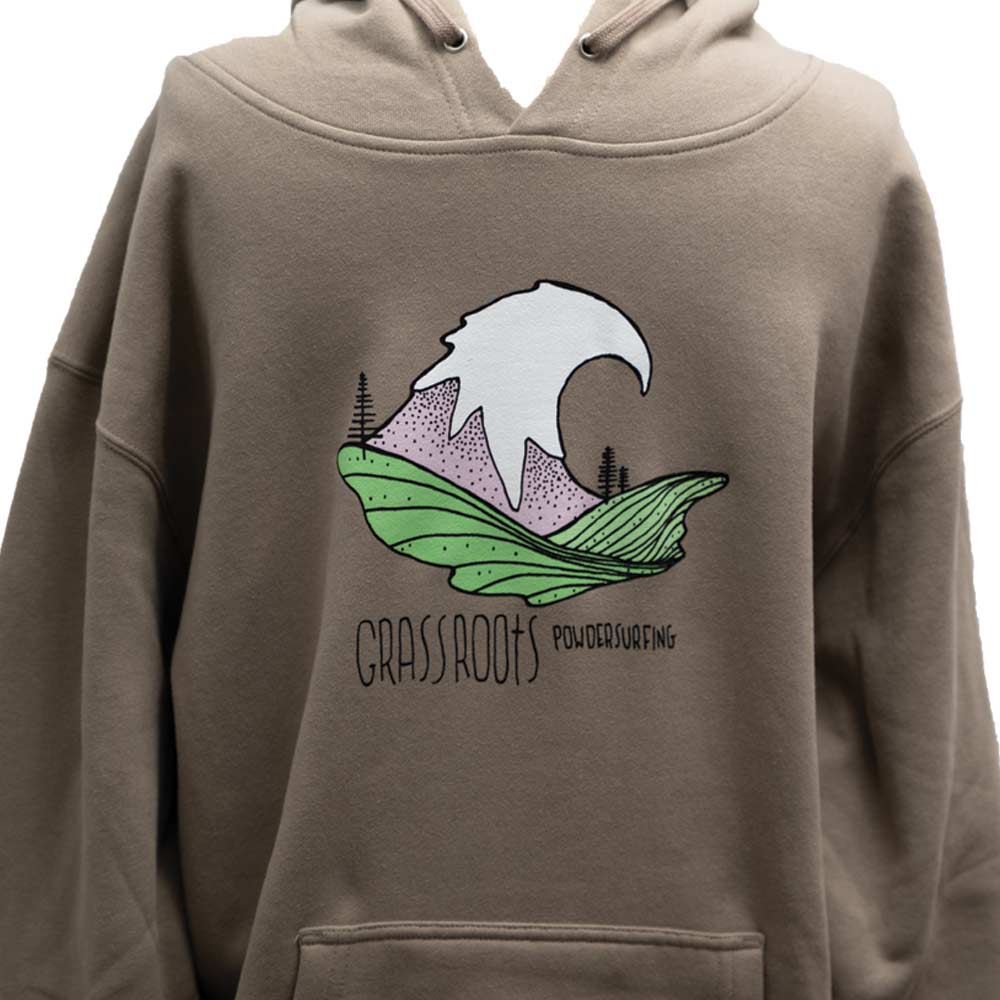 Our Earth Surf Hooded Sweatshirt features the artwork of Hannah Eddy, symbolizing the reimagining of rolling hills & mountain peaks as our surfable earth. Powsurfing is all about re-thinking the way we ride mountains and in doing so establishing a deeper connection with the mountains and nature’s precious elements. Powsurfing is an elevated state of mind as well as a lifestyle of kings and queens of the earth. Only a powsurer knows the feeling!